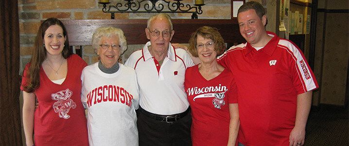 After serving in the navy, Ralph Wilcox x’48 began his college career by taking courses at Michigan and Iowa. He then transferred to the University of Wisconsin, where he met Lucille Koehl ’47. Lucille was the first person in her family to go to college, and the first of three generations of Badgers. Bucking tradition, Ralph left school to marry Lucille. They now have five children, nine grandchildren, and seven great-grandchildren. Following in their Badger footsteps are their oldest daughter, Linda Wilcox Arlt x’71, and two grandchildren, Nicholas Arlt ’01 and Allison Arlt Suchon ’03. This spring, the family celebrated Lucille’s 90th birthday. She got a special gift: meeting Bronson Koenig x’17, who was at the same restaurant celebrating a record-breaking basketball season.