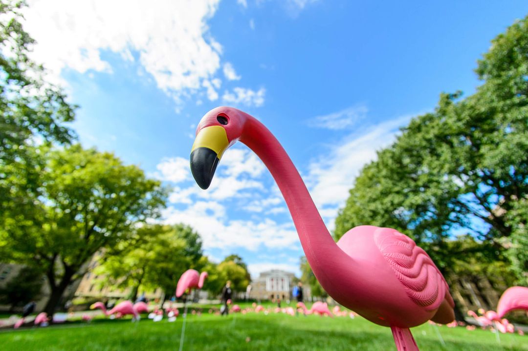 As the 1979–80 school year was about to begin, members of the now-famous Pail and Shovel Party came up with an idea: to welcome incoming students (and give them a preview of the silly side of college life) with a sea of pink plastic flamingos on Bascom Hill.