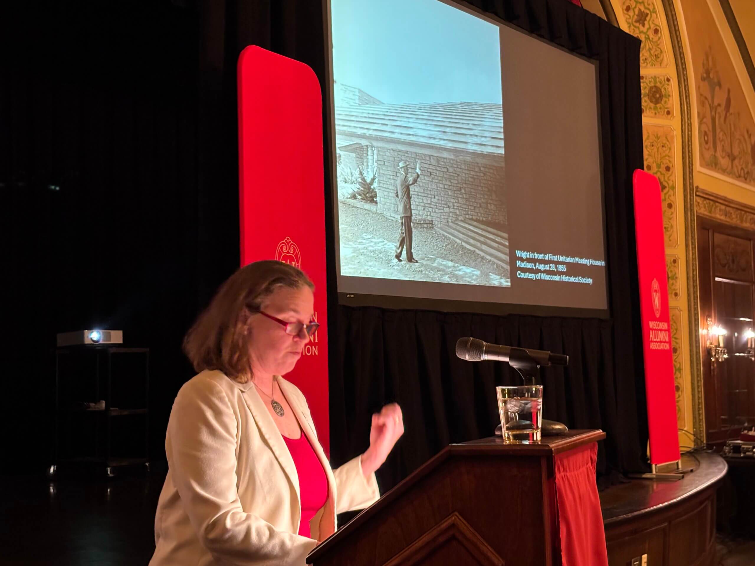 Andrzejewski, a historian of modern American architecture who has taught at UW–Madison since 2000, opened by inviting the audience to see Wright not as a mythological figure, but as a man very much of his time — shaped by his Wisconsin landscape, his mentors, and the social and technological upheavals he witnessed across nine decades of life.