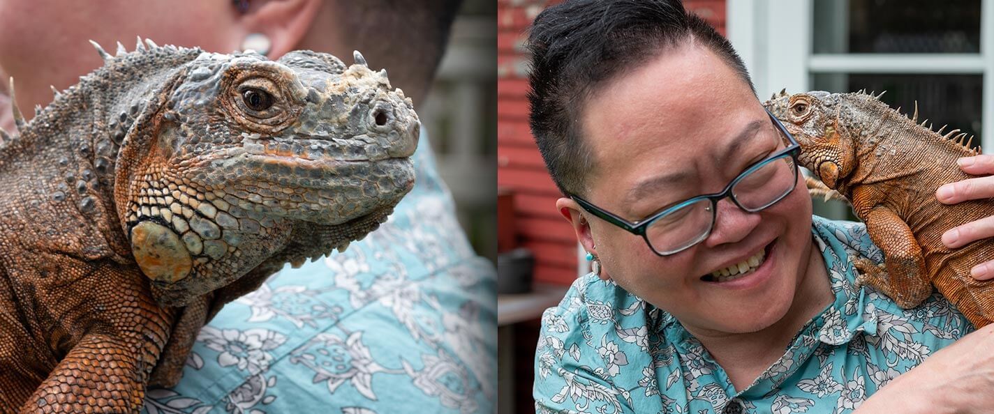 At first glance, you wouldn’t suspect Megyn Kelly the iguana needed rescuing from anything. But she’s a rescue nonetheless. Law professor Steph Tai found Megyn at Reptile Rescue when both needed saving: Megyn as the runt of her litter, Tai grief-stricken over the death of their previous iguana. Today, Megyn is content to indolently run the household. “She’s trained me help her be even lazier than she has to be,” says Tai. “Sometimes I’ll put food in her food bowl, and she’ll stick her tongue out as if to get the food, but she can’t quite reach. And at this point, I just move it closer to her.”